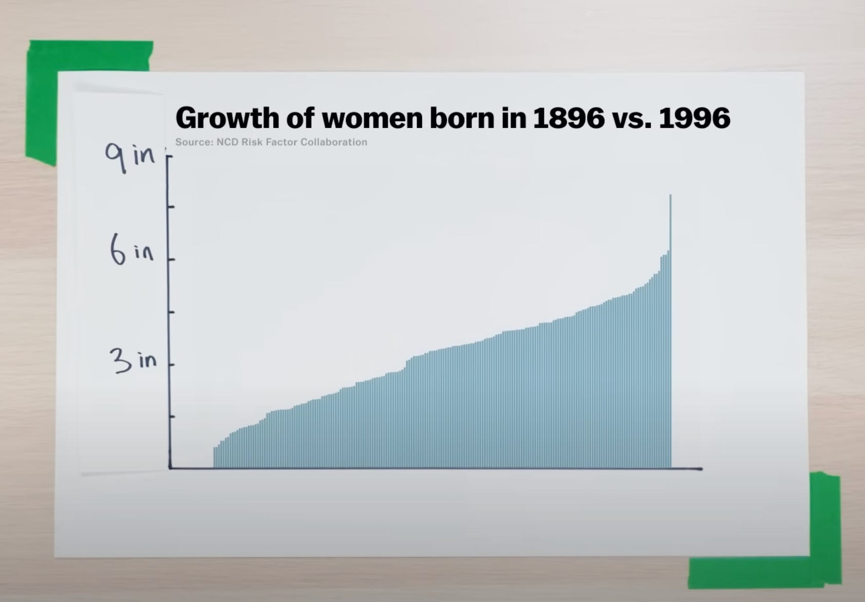 The video mentions the correlation of growth in height of men and women and quality of life. Definitely genes are the factor and that is the potential of how tall you can grow but the external factors also play a big role. Watch the full video to understand more about it—